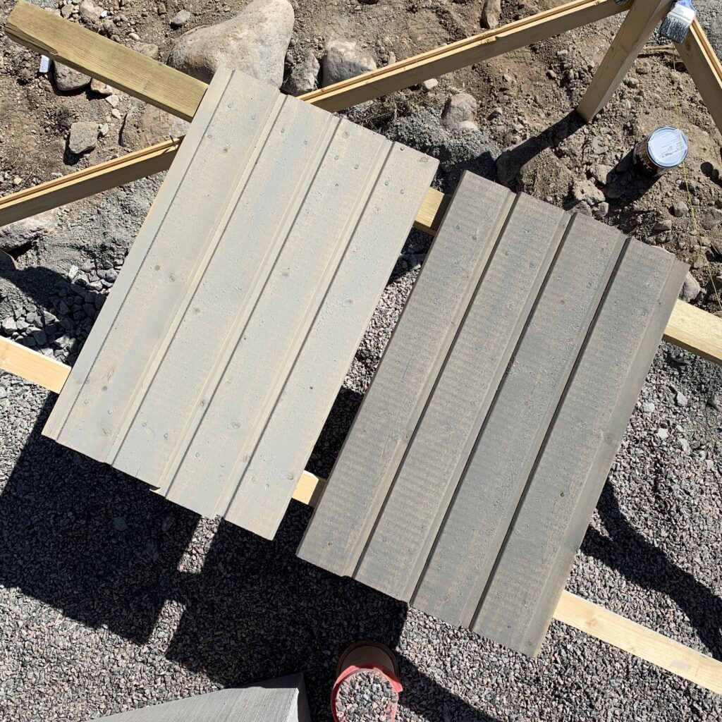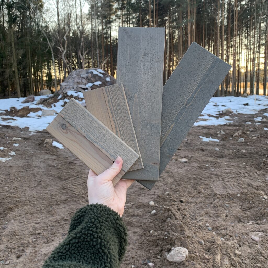 Världen av lasyr är nästintill lika stor som världen av färg, och gemensamt med färg är att lasyr är omöjligt att bestämma på provbitar i butiken. Vi började men en kulörkarta, landade i ett par alternativ, tittade på dem i butik och insåg att alla innehåller en svag ton av grön. I nästa butik tog vi med provbitar vi funderade över till tomten för att se nyanserna i olika ljus och kom därifrån med två alternativ, Jotun Trebitt Rökgrå och Jotun Trebitt Sandgrå. Resten av världen av lasyr fanns såklart fortfarande att utforska men det kändes som vi var på rätt spår och när jag får den känslan i magen tittar jag sällan åt ett annat håll.